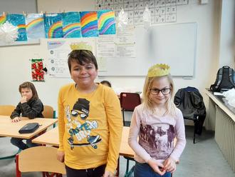 In Frankreich ist es Tradition, am 6. Januar den Königskuchen (la galette des rois) im Familienkreis zu essen. Im Königskuchen ist eine kleine Porzellanfigur oder eine Bohne (la fève) eingebacken. Wer das Figürchen oder die Bohne in seinem Kuchenstück findet, ist die Königin (la reine) oder der König (le roi) für diesen Tag und bekommt eine Krone (la couronne). In unseren Französischklassen (3. und 4. Schuljahr) wurde am 6. Januar diese schöne Tradition durchgeführt. Unsere diesjährigen Königinnen und Könige sind: