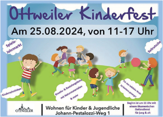 Das Jugendbüro Ottweiler lädt in Kooperation mit dem „Runden Tisch Kinder- und Jugendarbeit in Ottweiler“ zum Abschluss der Sommerferien zum Kinderfest ein. Am Sonntag, dem 25. August 2024, wird auf dem Gelände des „Wohnen für Kinder und Jugendliche“ des Schwesternverbandes gefeiert. Los geht es um 11 Uhr mit einem ökumenischen Gottesdienst für Alt und Jung im Freien. Gestaltet wird dieser von der Evangelischen Stadtmission, der Evangelischen Hoffnungskirchengemeinde und der Katholischen Kirchengemeinde Ottweiler.