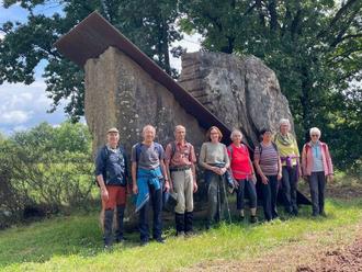 Nachdem sich alle kräftig gestärkt und auch etwas ausgeruht hatten, ging es auf einem Teilstück des Rötelsteinpfades weiter. Die Valentinskapelle, gleich neben dem Friedhof, erstrahlte in neuem Glanz. Einige Wanderer nahmen sich kurz die Zeit, um ein Kerzchen anzuzünden, andere um das seltsame „Pilzgebilde“ vor der Kapelle zu bestimmen.