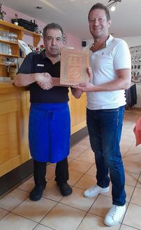 Gerne ist Ortsvorsteher Michael Schmidt der Einladung von Bruno Catania, Inhaber der Pizzeria-Restaurant „Roma“, gefolgt. Denn am Sonntag, dem 27. August war es in der Goethestraße 14 soweit: Es galt ein Jubiläum zu feiern - 10 Jahre Pizzeria-Restaurant „Roma“ unter Leitung des erfahrenen Gastronomen. „Ich habe mit meinem Team Vieles erlebt, Höhen und Tiefen, schöne Momente, aber auch die Corona-Zeit. Wir haben alles überstanden, und auch weiterhin sind wir für unsere Gäste gerne da“ erklärte er. Bruno Catania ist stolz auf seine 10 Jahre. Zuvor war er aber auch schon 30 Jahre in Ottweiler tätig – angestellt in der Pizzeria-Restaurant „Roma“ und in der Weinstube Enggaß. Ortsvorsteher Michael Schmidt kennt ihn seit Jahrzehnten und dankte ihm für seinen Einsatz: „Bruno Catania hat immer einen lockeren Spruch drauf und ist immer gut gelaunt“, stellte Michael Schmidt fest und fügte hinzu: „Herzlichen Glückwunsch und weiterhin viel Erfolg für Dich, Deine Familie und Dein Team.“