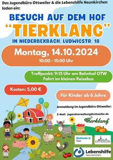 Am Montag, dem 14.10.2024 besuchen wir den Hof „Tierklang“ in Niederbexbach. Ein ungewöhnlicher Name für einen ganz außergewöhnlichen Hof. Ihr erlebt dort viele einheimische Tiere in hautnahem Kontakt, könnt sie streicheln, bürsten und füttern.