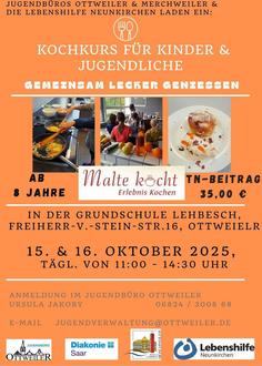 Für Kinder und Jugendliche, die an dem Thema „Kochen und Ernährung“ interessiert sind, bieten die Jugendbüros der Stadt Ottweiler (eine Einrichtung der Diakonie Saar), der Gemeinde Merchweiler und die Lebenshilfe Neunkirchen in den Osterferien einen 2tägigen Kochkurs an. Und es wird sicher wieder richtig lecker und vielfältig werden.