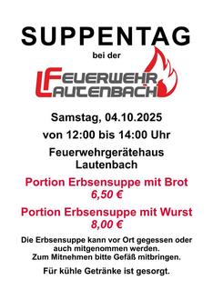 Die Feuerwehr Lautenbach veranstaltet am Samstag, dem 04.10.2025 wieder ihren Suppentag. Zwischen 12 und 14 Uhr gibt es im Feuerwehrgerätehaus die bekannte Erbsensuppe mit Wurst und Brot. Die Suppe kann entweder vor Ort gegessen oder auch mitgenommen werden, zum Mitnehmen bitte ein Gefäß mitbringen.