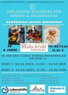 In den Faschingsferien laden das Jugendbüro Ottweiler und die Lebenshilfe Neunkirchen Kinder und Jugendliche ab 8 Jahren zu gemeinsamen Kochkursen in die Eric Carle Schule nach Mainzweiler ein.