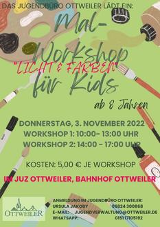 Das Jugendbüro der Stadt Ottweiler lädt am Donnerstag, 3. November 2022, Kinder und Jugendliche ab 8 Jahren zu einem Mal-Workshop ein. Ihr lernt verschiedene Techniken kennen und könnt mit Farben und Materialien experimentieren und so euer ganz persönliches Kunstwerk gestalten.