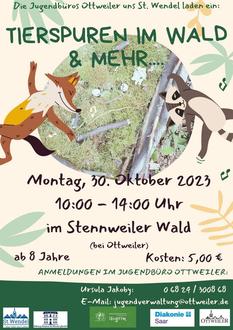 Am Montag, dem 30. Oktober 2023, laden die Jugendbüros Ottweiler und St. Wendel Kinder ab 8 Jahren zu einer spannenden Exkursion in den Stennweiler Wald bei Ottweiler ein. Unter der kundigen Führung des Waldpädagogen Michael Müller kommen wir so der Tier- und Pflanzenwelt unseres heimischen Waldes auf die Spur. Auf spielerische Art und Weise lernen wir so viel über die Lebensweise der Tiere und die Funktionen der Pflanzen.