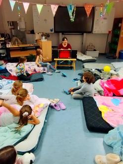 Am Dienstag, 08. Oktober 2024, übernachteten die Kinder der Klasse 3.3 mit ihrer Lehrerin Birgit John in der Schule. Der Klassensaal wurde zum „Schlafsaal“ und mit Matratzen, Decken und Stofftieren kuschelig eingerichtet. Als Überraschung besuchte Imker Christian Pfeil die Kinder und berichtete ihnen Wissenwertes und Interessantes über die fleißigen Bienen. Nach diesem kurzweiligen Vortrag wurde der Klassensaal zur Disco und die Kinder durften sich Lieblingslieder wünschen, zu denen lautstark gesungen und getanzt wurde. Zur Stärkung gab es anschließend Pizza. Danch las Schoolworkerin Esther Graumann das Buch „Heinrich möchte brüten“ mit dem Erzähltheater Kamishibai vor. Die Kinder hörten gespannt zu und mussten häufig laut lachen. Highlight des Abends war der Gang mit den Taschenlampen durch das dunkle Schulgebäude, da sich die Schüler selbst davon überzeugen wollten, dass es das Schulgespenst nicht gibt. Zum Einschlafen durfte jeder noch in seinem eigenen Buch lesen und sich in sein Matratzenlager einkuscheln. Diese Lesenacht war wirklich ein großer Spaß für alle Kinder.