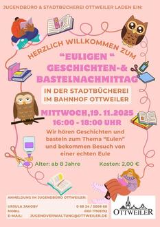 Das Jugendbüro und die Stadtbücherei Ottweiler laden euch am Mittwoch, dem 19.11.2025, um 16:00 Uhr in die Bücherei ein. Dort lesen wir spannende und unterhaltsame Geschichten über die schlauen Nachtvögel und lassen dabei unsere Fantasie fliegen. Parallel dazu wird im Foyer dazu gebastelt- natürlich zum Thema Eule!