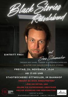 Jens Schumacher erfindet Geschichten seit er einen Stift halten kann. Seit Mitte der 1990er Jahre veröffentlicht er Bücher und Spiele für Kinder, Jugendlicher und Erwachsene, darunter Fantasyromane, Krimis, interaktive Spielbücher sowie Sachtitel. Er ist Träger des saarländischen Kinder- & Jugendbuchpreises und gehört zum Autorenteam der international erfolgreichen Rätselspielserie BLACK STORIES. Am Freitag, dem 22. November, lädt Jens Schumacher zu einem interaktiven Rätselabend rund um seine BLACK STORIES in die Stadtbücherei Ottweiler im Bahnhof ein.