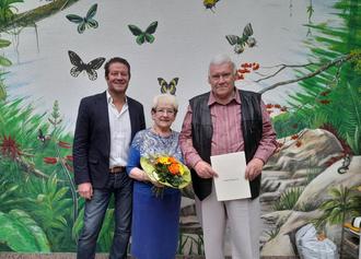 Für den Ortsvorsteher Michael Schmidt war es diesmal eine besondere Ehre zu gratulieren, denn das Jubelpaar war niemand geringeres, als die Besitzer vom Ottweiler Insektenmuseum. Jürgen Sticher, Tierpräparator und Entomologe, hat insgesamt 27-mal Asien und andere Erdteile bereist: Von Thailand - Borneo - Java - Sumatra -Celebes - New Guinea bis Australien - Madagaskar und Mexiko. Er hat in Asien in verschiedenen Ländern Zuchtfarmen für Insekten mit aufgebaut. In diesen Farmen werden gefährdete Insekten nachgezüchtet und zu 70% wieder freigelassen. Jürgen Sticher hat bei seinen Exkursionen in die Urwälder Asiens auch Käfer entdeckt, welche der Wissenschaft bisher noch unbekannt waren. Diese Insekten tragen nunmehr den Artennamen "sticheri". Bei den meisten Reisen begleitete seine Ehefrau Ingrid ihn, dabei unterstütze sie wo es nur ging. Auch zu Hause arbeiten sie Hand in Hand.