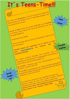 Liebe Teenstimer und alle, die es werden wollen. Am 24.11.2023 könnt ihr gerne mit viel Hunger in die Teestube kommen. Wir werden zusammen Burger machen und gemeinsam essen, auch eine vegetarische Variante ist möglich. Ebenso könnt ihr die Angebote der Teestube wie zum Beispiel den Tischkicker nutzen.