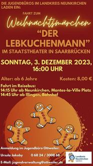 Am Sonntag, dem 3. Dezember 2023, bieten die Jugendbüros des Landkreises Neunkirchen, eine Fahrt zur 16:00-Uhr-Vorstellung im Staatstheater nach Saarbrücken an. Das Stück ist für Kinder ab 6 Jahren geeignet. Die Anmeldung erfolgt über das Jugendbüro Ottweiler.
