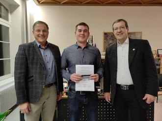 Weiterhin alles Gute für die Zukunft haben Bürgermeister Holger Schäfer und WfG-Geschäftsführer Klaus Häusler dem jungen Metallbaumeister Maximilian Weiskircher gewünscht. Denn der Mainzweiler Bürger, zugleich Produktionsleiter der Neunkircher Firma Krummenauer - Anlagenbau, zählt zu den landesbesten Jungmeistern im Saarland, konnte aber bisher noch nicht geehrt werden. Deshalb kam es zu einer kleinen Feierstunde im Rathaus. Der begeisterte Feuerwehrmann war der entsprechenden Einladung gerne gefolgt. Insgesamt erhielten die Jungmeister schon ihre Auszeichnungen, zunächst auf der Landesebene und dann auch auf der Kreisebene. „20 der Landesbesten wohnen im Kreis Neunkirchen“, erklärte der Leiter der Wirtschaftsförderung im Kreis Neunkirchen. Die jungen Leute hätten trotz mitunter schwierigen Bedingungen den Willen und das Engagement zur außerordentlichen Leistung erbracht, wofür ihnen zu danken sei. Der deutsche Meisterbrief stehe seit Jahrzehnten für Qualität und Qualifizierung. Dem schloss sich der Bürgermeister an. Aus dem Bereich der Stadt Ottweiler ist neben Maximilian Weiskircher zugleich Kai-Dennis Scheidhauer als landesbester Metallbaumeister geehrt worden.