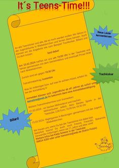 Seit dem 01.01.2024 gehören wir, die Ev. Kirchengemeinde Ottweiler zu der Gesamtgemeinde, der Ev. Hoffnungskirchengemeinde. Zu dieser gehört unter anderem auch Wiebelskirchen. So wie wir im Bereich Ottweiler die Teestube haben, so gibt es in Wiebelskirchen ebenso einen Jugendraum. Diesen wollen wir gemeinsam mit der Teenstime besuchen und kennenlernen. Dort werden wir Tischkicker und Billard gemeinsam mit den Jugendlichen aus Wiebelskirchen nutzen. Los geht’s am Freitag, dem 23.02.2024 um 16:00 Uhr an der Teestube. Wir werden im Gemeindebus und gegebenenfalls in einem Privat PKW fahren, die Teilnahme ist kostenlos. Anmeldungen ab sofort unter teenstime@web.de. Wir freuen uns auf euch!