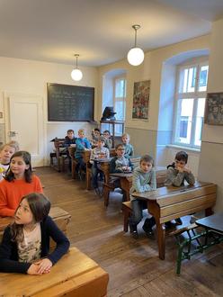 Gleich zwei Museumsbesuche standen für die Kinder der Klasse 3.2 der Grundschule Lehbesch an. Zunächst ging es ins Schulmuseum. Im Unterricht hatten die Schülerinnen und Schüler sich intensiv auf das Thema „Schule früher und heute“ vorbereitet. Im Museum gab es viel zu bestaunen. Besonderen Eindruck hinterließen die alten Schulregeln und Strafen, wie zum Beispiel die bekannten Schläge mit dem Rohrstock, das Knien auf dem Erbsenbrett oder das Tragen einer Eselsmütze. Ganz viel Freude bereitete auch das Schreiben mit Feder und Tinte wie früher. Zum Schluss bedankten sich die Kinder und Frau Meiser bei Herrn Erwin Breit für die kurzweilige und spannende Führung.