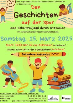 Am Samstag, dem 15. März, laden das Jugendbüro und die Stadtbücherei Ottweiler Familien dazu ein, sich auf Spurensuche zu begeben. Wir starten um 14:00 Uhr im Jugendzentrum im Bahnhof Ottweiler. Danach geht es auf große Schnitzeljagd. An fünf aufregenden Stationen, verteilt in der Ottweiler Innenstadt, taucht ihr ein in die wunderbare Welt der Geschichten und werdet die ein oder andere Aufgabe lösen.