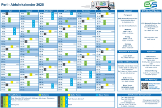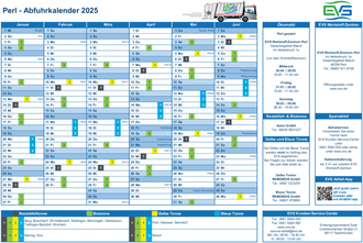 Die Abfuhrtermine für die Restabfall- und Biotonne in Perl bleiben 2025 unverändert. Die aktuellen Termine können auf der Website des EVS unter www.evs.de/abfuhrtermine eingesehen und heruntergeladen werden. Der adressgenaue Online-Kalender bietet Wochen-, Monats- und Jahresübersichten sowie eine praktische E-Mail-Erinnerungsfunktion.
