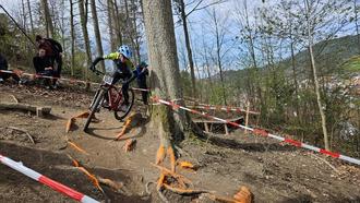 In Hausach im Schwarzwald stand am letzten Wochenende der erste Nachwuchs-Bundesliga Doppelpack mit je einem Wettbewerb am Samstag und am Sonntag auf dem Programm. Eröffnet wurde die höchste nationale Rennserie bereits Ende Januar mit einem Athletik Wettkampf. Rund zweieinhalb Monate später ging es jetzt endlich um die ersten Wertungspunkte auf anspruchsvollen Rennstrecken. In der U15 Klasse sind mit Jan Weiler, Silas Schuster und Julius Klose in diesem Jahr erstmalig drei unserer Sportler für den Saarlandkader nominiert und waren auch in Hausach am Start. Für Jan Weiler und Silas Schuster ist es die erste Saison auf nationaler Ebene. Für beide geht es in erster Linie darum Erfahrung zu sammeln und sich im nationalen Ranking nach vorne zu arbeiten. Julius Klose konnte schon 2022, als jüngerer Jahrgang, regelmäßig die Top 5 der Altersklasse U15 erreichen. Entsprechend groß waren auch die Ambitionen bei der Anreise im Schwarzwald. Schon am Freitag beim Streckentraining zeichnete sich ab, dass es ein gutes Wochenende werden kann und so kam es dann auch. Den ersten Wettkampf am Samstag konnte er fehlerfrei für sich entscheiden. In einem Sekunden-Krimi kämpften fünf Fahrer um den Tagessieg. Am Ende konnte sich Julius Klose mit 2,8 Sekunden Vorsprung die oberste Stufe auf dem Podium sichern. Am Sonntag wurden die Karten leider noch einmal neu gemischt. Regenfälle in der Nacht veränderten die Cross-Country Strecke grundlegend und sorgten für etwas Hektik bei den Mechanikern. Letztendlich verpasste Julius Klose den Vorstartaufruf um wenige Minuten und musste deshalb aus dem Mittelfeld starten. Die verdiente Belohnung für den Vortagessieg (Startaufstellung nach Vortagesergebnis) konnte er somit nicht auskosten. Während die Konkurrenz direkt nach dem Start Druck machte musste er sich durch das Gedränge nach vorne kämpfen. Mit einer puren Willensleistung schaffte er es am Ende auf Platz 2 im Sonntagsrennen und konnte damit auch die Gesamtführung in der MTB Nachwuchs-Bundesliga übernehmen.