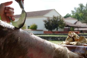 Mit einem Messer entfernt der Gerber in der Villa Borg die Fellhaare von der Haut eines Rehs.
