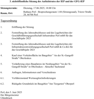 | 3. | Feststellung des Jahresabschlusses und des Lageberichtes der Infrastrukturentwicklungsgesellschaft Perl mbH & Co.KG für das Geschäftsjahr 2023 |