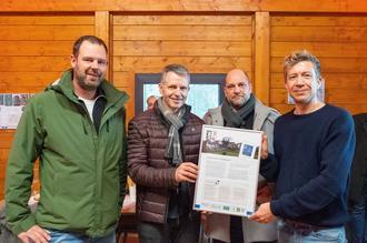 (v.r.n.l.) Staatssekretär Sebastian Thul und Thomas Schreiner vom Ministerium für Umwelt, Klima, Mobilität, Agrar und Verbraucherschutz, Bürgermeister Ralf Uhlenbruch und der Stellvertretende Ortsvorsteher von Oberleuken/Kesslingen/Münzingen Sascha Lahr