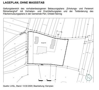 Im Perler Ortsteil Nennig befindet sich am nordöstlichen Siedlungsrand der bereits seit Jahren etablierte Römerberghof. Aufgrund seiner exponierten Lage mit Blick über das Moseltal soll dieser Standort in Zukunft besser touristisch genutzt und vermarktet werden. So sollen u. a. max. 8 Tiny-Häuser errichtet werden, um zusätzliche Übernachtungsmöglichkeiten zu schaffen. Die Erschließung des Gebietes ist über die Straße „Römerberg“ gesichert, der ruhende Verkehr kann vollständig auf dem Privatgrundstück untergebracht werden.
