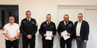 Beigeordneter Hoffmann, Wehrführer Nittler sowie der stellvertretende Wehrführer Ernst gratulierten zur Wiederwahl und wünschten dem Führungsteam weiterhin viel Erfolg in ihrer verantwortungsvollen Aufgabe.