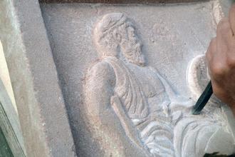 Steinmetz: Vorführung der Reliefherstellung mit Erläuterungen zu handwerklichen und künstlerischen Aspekten.