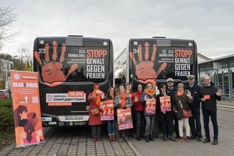 Zu den sogenannten Orange Days unterstützt die Gleichstellungsstelle des Landkreises Merzig-Wadern eine Busaktion auf Initiative der Soroptimistinnen Merzig-Saarlouis mit der Verkehrsgesellschaft Merzig-Wadern (VMW), der Kreisstadt Merzig und der Polizeiinspektion Merzig: Zwei Linienbusse machen mit weithin sichtbarer Werbung auf den Busrückseiten und auf Plakaten im Innenraum auf häusliche Gewalt und die Telefonnummer des bundesweiten Hilfetelefons aufmerksam. Unter 116 016 ist dieses jederzeit kostenfrei erreichbar – für Betroffene, ihr soziales Umfeld und Fachkräfte. Die Busse werden bis Ende des Jahres durch das nördliche Saarland fahren.
