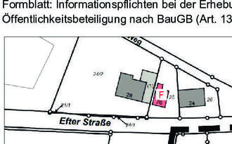 Sofern Sie ihre Stellungnahme ohne Absenderangaben abgeben, erhalten Sie keine Mitteilung über das Ergebnis der Prüfung. Weitere Informationen entnehmen Sie bitte dem Formblatt: Informationspflichten bei der Erhebung von Daten im Rahmen der Öffentlichkeitsbeteiligung nach BauGB (Art. 13 DSGVO), welches mit ausliegt.