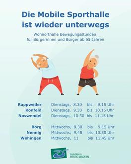Der Landkreis Merzig-Wadern bietet mit der „Mobilen Sporthalle“ wohnortnahe Bewegungsstunden für Bürgerinnen und Bürger ab 65 Jahren an.