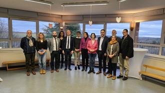 Foto: S. Schwarz; Fabien Kratz (Inspektor für nationale Bildung im Bezirk Sarreguemines-Est), Marie Kleinhentz (französische Lehrerin), Jean Francois Bonasso (Assistent des Akademischen Direktors der Academy Moselle), Karine Stutzmann (Inspektorin für nationale Bildung, Direktorin des grenzüberschreitenden Zentrums von Saint-Avold), Vincent Seitlinger (Abgeordneter der Nationalversammlung), Eva-Maria Urban (KiTa-Leiterin), Valérie Rabault (Vizepräsidentin der Nationalversammlung), Angelika Glöckner (Bundestagsabgeordnete), Klaus Weber (Verbandsbürgermeister PS-Land), Etienne Megel (Bürgermeister Liederschiedt), Karen Schönenberg (Fachreferentin Bildungsministerium Rheinland-Pfalz), Francois Nadler (Bildungsberater).