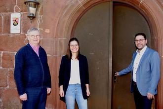 Foto: Feldner; Am Eingang zum Trauzimmer der VG- Standesamt-Außenstelle „Alte Kirche Vinningen“, Standesbeamter Bürgermeister Klaus Weber, Standesbeamtin Kathrin Aplas und Standesbeamter Harald Borne (von links im Bild) von der Verbandsgemeindeverwaltung Pirmasens-Land.