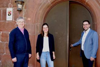 Am Eingang zum Trauzimmer der VG- Standesamt-Außenstelle „Alte Kirche Vinningen“, Standesbeamter Bürgermeister Klaus Weber, Standesbeamtin Kathrin Aplas und Standesbeamter Harald Borne (von links im Bild) von der Verbandsgemeindeverwaltung Pirmasens-Land. Foto: Feldner