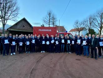 Im Auftrag des Landes Rheinland-Pfalz wurde von Bürgermeister Klaus Weber und Wehrleiter Hans-Peter Maschino zusätzlich zur Einsatzmedaille auch eine Verleihungsurkunden ausgehändigt. So fand die Anerkennung für die Helferinnen und Helfer einen würdigen Rahmen.