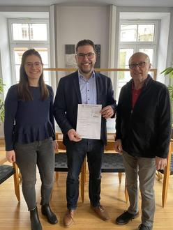 Übergabe der Bestellungsurkunde zum Eheschließungsstandesbeamten des Standesamtsbezirks Pirmasens-Land an Herrn Bürgermeister Klaus Weber - v.l.n.r.: Standesbeamtin der Verbandsgemeinde Pirmasens-Land, Frau Kathrin Aplas, Bürgermeister Klaus Weber, 1. Beigeordneter Günther Röhm (Foto: VG-Verwaltung)