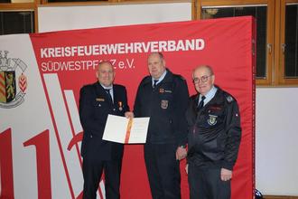 Die Verleihung im Namens des Deutschen Feuerwehrverbandes wurde vollzogen durch den Vizepräsidenten des Landesfeuerwehrverbandes, Herr André Luipold, und durch den Vorstand des Kreisfeuerwehrverbandes, Herr Werner Oster.