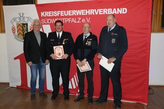Vlnr.: Beigeordneter der VG PS-Land Jürgen Noll; Dominik Kühnel; Claus Wagner, Wehrleiter Hans-Peter Maschino. Bei der Verleihung nicht anwesend sein konnte Peter Huber. Foto: Maschino