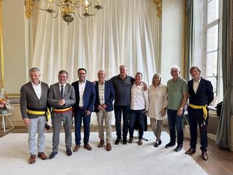Foto: VG; v.r.n.l.: Matthis Samyn (Schepen für Personal, Organisation, freiw. Leistungen,Tourismus), Jürgen Noll (ehem. Komiteevorsitzender Trulben); Virginia Hunkler (Komiteesekretärin Trulben); Dirk Hoirelbeke (Komiteesekretär Roeselare); Werner Hunkler (kommisarischer Komiteevorsitzender Trulben); Glinn Veermeesch (Komiteevorsitzender von Roeselare), Klaus Weber Bürgermeister; Kris Declercq (Bürgermeister der Stadt Roeselare); Piet Delrue (Schepen für Sport Nachbarschaften, Soziales)