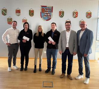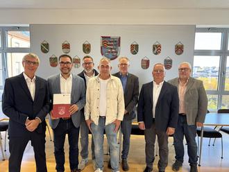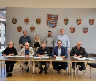 Foto: VG; vordere Reihe v.l.n.r.: Ortsbürgermeisterin Obersimten Frau Silke Rink, Ortsbürgermeister Ruppertsweiler Herr Herbert Heid, Ortsbürgermeister Kröppen Herr Steffen Schwarz, Bürgermeister Klaus Weber, Ortsbürgermeister Vinningen Herr Willy Diemert; hintere Reihe v.l.n.r. Sachbearbeiter Kindergärten Herr Carsten Schmidt, Sachbearbeiterin Schulen Frau Juliette Teubert, 1. Beigeordneter Ruppertsweiler Herr Michael Becker, OZG- und Digitalisierungsbeauftragter der VG Herr Andreas Scheidle