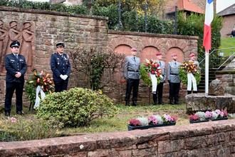Deutsche und Franzosen legen gemeinsam am Vinninger Ehrenmal einen Kranz nieder