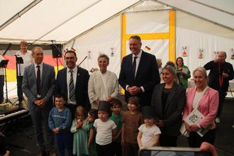 Foto G. Kupper: v.l.n.r. Bürgermeister Klaus Weber, Kita-Leitung Eva-Maria Urban, Ministerpräsident Alexander Schweitzer, Directrice Marie Hoehn, Landrätin Dr. Susanne Ganster, Kindergartenkinder Kindergarten Liederschiedt