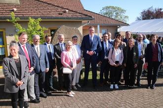 Foto G. Kupper; VG; v.l.n.r. Directrice Marie Hoehn, Ortsbürgermeister Hilst Philipp Andreas, Ortsbürgermeister Roppviller Serge Stebler, Vice-Président du Département de la Moselle David Suck, Präsident des SIVU Etienne Megel, Landrätin Dr. Susanne Ganster, Kindergartenleitung Eva-Maria Urban, Ministerpräsident Alexander Schweitzer, Bürgermeister Klaus Weber, Inspectuer de l`Education Nationale Laurent Hen, Vice-présidente de la commission Santé, solidarité, citoyenneté Joelle Wey, Ministerium für Bildung RLP Karen Schönenberg, Conseillère Départementale Sophie Pastor, Ortsbürgermeister Schweix Marco Maas, Bundestagsabgeordneter Florian Bilic, Ministerium für Bildung RLP Judith Bous,