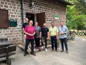 V.l.n.r.: Michael Daub, 1.Vorsitzender PWV-Verein Starkenbrunnen, Miarkus Zwick, Oberbürgermeister der Stadt Prmasens, Michaela Strohmeier, neue Pächterin, Florian Bilic, 2. Vorsitzender PWV Starkenbrunnen, Klaus Weber, Bürgermeister VG Pirmasens-Land, Philipp Andreas, Ortsbürgermeister Hilst. Foto: Weber