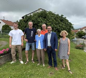 Foto: Weber; Die Jubilarin mit Ihren beiden Söhnen Martin und Thomas, Schwiegertochter Sigrid, Enkelsohn Jonas sowie Ortsbürgermeister Klaus Weber