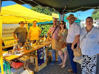 Beim Stand der Imkergemeinschaft Trulben-Bottenbach machen ab dritter Person vlnr Station: Trulbens Ortsbürgermeister Harald Hatzfeld mit Ehefrau Gaby sowie unser Bürgermeister Klaus Weber mit Ehefrau Steffi. Foto: Bernd Danner