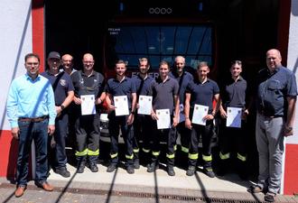 Nachdem allen Teilnehmern die erfolgreiche Teilnahme am Lehrgang bekannt gegeben wurde, erhielten Sie durch Verbandsgemeindebürgermeister Klaus Weber, Lehrgangsleiter Oliver Feix , Ausbilder Andreas Veidt und dem Wehrleiter VG-Pirmasens-Land Hans-Peter Maschino ihre Urkunden.