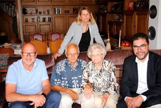 Zur „Eisernen Hochzeit“ von Rosel und Walter Lelle (Bildmitte mit im Hintergrund Tochter Heike Babilon) gratulierten Ortsbeigeordneter Willy Diemert (links) und Verbandsbürgermeister Klaus Weber (rechts). Text und Foto: Feldner