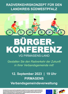 Am Dienstag, 12. September, haben die Bürgerinnen und Bürger der Verbandsgemeinde Pirmasens-Land die Möglichkeit, sich aktiv an der Entwicklung des kreisweiten Radverkehrskonzeptes zu beteiligen: Im Rahmen einer Bürgerkonferenz stellt das Verkehrsplanungsbüro R+T aus Darmstadt die bisherigen Ergebnisse und insbesondere die in der Verbandsgemeinde geplanten Maßnahmen vor und diskutiert diese mit den Anwesenden. Die Bürgerkonferenz beginnt um 19 Uhr im Sitzungssaal der Verbandsgemeindeverwaltung Pirmasens-Land, Bahnhofstraße 19 in Pirmasens.