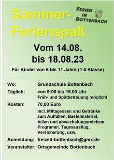 Die Ortsgemeinde Bottenbach veranstaltet in der vierten Sommerferien-Woche (14.08.2022 bis 18.08.2023) eine Ferienfreizeit für Kinder unter dem Motto „Ferien in der Heimat“. Kurzfristig sind nochmals Plätze frei geworden.